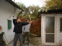 Ója dělá machry, jak to umí (nebo lépeřečeno neumí) s lukem. |